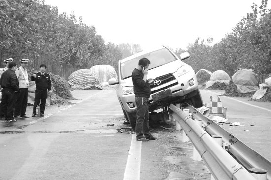 9月26日下午,在大广高速项城收费站入口前,一辆丰田越野车冲上了隔离栏(如右图)并滑行数米,所幸无人员伤亡。晚报记者 张猛 摄
