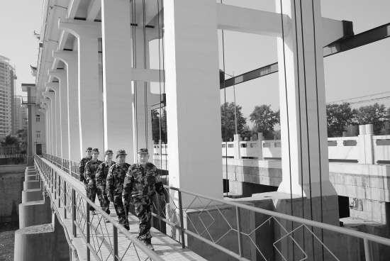 昨日,几名巡逻队员在周口大闸上巡逻。近日,市水务局抽调10多人成立一支反恐巡逻队,分成两组,对周口大闸上下游500米范围内和其他重点水利工程设施实行24小时监控和巡逻。通讯员 董建红 摄