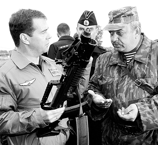俄罗斯总统德米特里·梅德韦杰夫(左)28日观看一次军事演习时,身着军服、手持机枪,展现出一副“硬汉”形象。 中新 摄