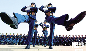 军姿不正“照镜子”、摆臂踢腿不定位“拉绳子”、踢腿速度慢“绑袋子”、练习脚踝功“踢石子”、纠正八字脚“踩沙子”、正步绕脚尖“压脚跟子”……为了在全世界面前走出整齐划一如刀削斧劈的威武效果,实现力与美统一的效果,受阅官兵们还发明创造出大量训练方法和器材。