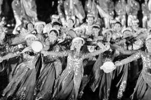 跳呀!伴随着《北京喜讯到边寨》的粗犷旋律,身披节日盛装的各族群众载歌载舞,尽情狂欢。翻飞的红绸舞出最美的云霞,巨大的表演阵容形成空前的盛景。广场上霓裳丽影,集体舞、交谊舞、拉手跑圈舞……中华儿女万众欢腾伴此景。