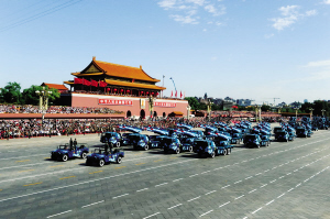 “开始!”随着胡锦涛主席一声令下,逾千名军乐队员高奏激昂的阅兵曲。在房峰辉的陪同下,胡锦涛乘检阅车沿东长安街向东驶去。