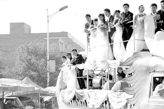 昨日,商水首届集体婚礼在该县阳城公园隆重举行。10对新人共乘一辆精心设计的“龙”型婚车,手持国旗,高呼着“祖国你好”、“祖国万岁”的口号,沿该县的备战路、行政路等主要道路缓缓驶过,沿途经过之处,引来大量市民驻足围观,成为一道亮丽的风景线。 晚报记者 马治卫 摄