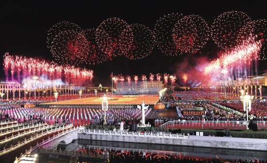 天安门广场上空璀璨的焰火。 图片均据新华社电