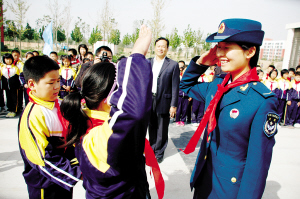 昨天上午10时,秋日艳阳下,英姿飒爽的女兵林贝贝准时出现在周口市第一实验小学门口,顿时,掌声一片。