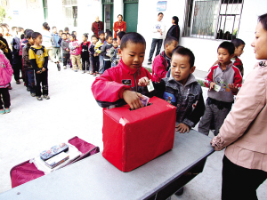 为了欢迎楚楚的到来,牛营小学举行了简短的欢迎仪式。欢迎仪式结束后,该校师生纷纷慷慨解囊,为楚楚捐赠了近千元的爱心款(如右下图)。“我早就想为楚楚捐款,今天正好遇上,没多有少,这是一份心意,希望他赶快好起来!”附近居民陈秀荣听说楚楚到牛营小学上学了,也赶到现场捐出100元钱。