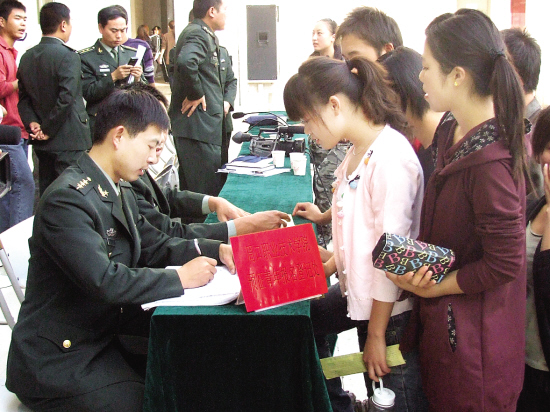 昨日,周口军分区、川汇区武装部有关人员深入到周口师范学院、周口职业技术学院等市内院校宣传征兵政策,确保为部队输送高素质兵源。今年出台的一系列优惠政策,大大鼓励了在校大学生应征入伍的积极性。图为大学生踊跃进行兵役登记。晚报记者 陈永团 摄