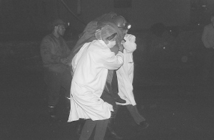 10月25日,救援人员和医护人员护着被救矿工走出矿井。记者25日在陕西省神木县冒顶煤矿永兴高庄煤矿现场获悉,经过救援队员连续8昼夜的努力,被困8天多的3名矿工于凌晨3时30分许被成功获救。目前3名被救矿工生命体征正常,正在神木县医院接受医学观察。据了解,17日凌晨1时许,陕西省神木县永兴高庄煤矿601工作面发生冒顶事故,当班27人,24人安全升井,3人被困于井下。新华社发
