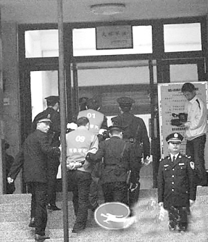 26日上午8时10分起, 被告人被分3批陆续押解至法院。此时,围观群众纷纷朝押解车张望。记者注意到,押解被告人的不仅有法警, 同时还有武警。而在法庭外,为确保庭审安全,法警们都是荷枪实弹,气氛庄严而紧张。