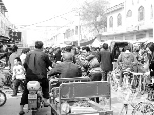 当天11时40分许,记者来到位于县城兴华路上的实验小学门前,只见本来就不太宽的路面两边摆满了水果摊、蔬菜摊,不少市民在此买菜,讨价声此伏彼起,许多车辆在拥挤的路中央举步维艰,不停地鸣喇叭,学校门口两边的人行道上也被卖玩具、零食等的小摊占据着。学生一走出学校大门,随即被淹没在嘈杂的人流和车流中(如图)。