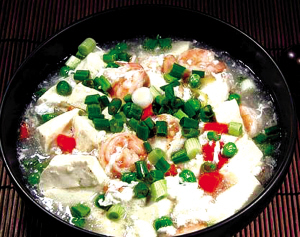 八宝豆腐羹是江南名菜。话说当年康熙皇帝第一次南巡时,由于旅途劳顿,胃口全无。得月楼名厨张东琯奉命为皇帝调理胃口,他绞尽脑汁,终于想出以江南的时鲜蔬菜虾仁、火腿、鸡肉、香菇等配料,与豆腐一起做成八宝豆腐羹。