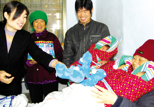 11月2日,医护人员将3个健康的婴儿从育婴室保温箱取出交给了吴冬梅夫妇,夫妻俩看着3个可爱的孩子又是欣喜又是忧。原来,多年来,正是靠着丈夫李自德常年在外打工挣钱,吴冬梅一家才勉强维持生活。看着怀里的3个嗷嗷待哺的孩子,吴冬梅夫妇一脸愁容。该县妇幼保健院领导了解情况后,当即决定免去他们的部分医疗费。3日上午,该县某乳业公司业务经理闫金梅闻讯后,为三胞胎送去了价值1千多元的奶粉及儿童玩具(如图)。该县不少居民也纷纷拎着营养品、水果、衣物等到病房看望和慰问三胞胎,他们都真诚地希望三胞胎身体健康、茁壮成长!线索提供 刘宏彬