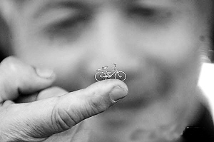 3日,张天伟将“自行车”停放在自己的手指肚上。当日,西安市民间艺人张天伟的新作“微型自行车”在西安市群众艺术馆亮相。据悉,这辆“自行车”由3根牙科用的直径为0.2毫米的不锈钢丝制成,车身长20毫米,高12毫米,车轮直径7毫米。车身虽小,车把和脚蹬竟还能转动。中新 摄