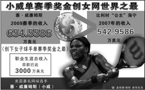 本报综合消息 小威廉姆斯今年风光无限,在多哈年终总决赛收获155万美元的女单冠军奖金之后,小威再创女子网坛一项新纪录:美国黑珍珠在2009赛季收获654.558万美元的年度奖金,这一数字超越了比利时球后海宁在2007赛季创造的542.9586万美元的单赛季奖金纪录,海宁也是当年年终总决赛的冠军。多哈之行结束之后,小威目前手握的总奖金数已达到2850.6993美元。(刘晓星)