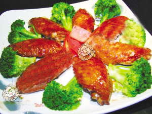8. 将鸡翅摆盘,放入西兰花做装饰,即可上桌食用。
