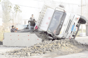 近日,本报陆续接到群众反映,称在宽阔的大庆北路与太清路交叉口,以及贾鲁河桥两头突然“长出”了几道用砖垒起的隔离墙,使得这些道路仅容一辆小轿车通行,不少过往司机一不小心,爱车就会“亲”到隔离墙,而且由于隔离墙没有任何反光标示,晚间发生车祸的事件时有发生。昨日上午,记者分别来到这两个地段进行采访,发现那里过往车辆很多,隔离墙虽然“上岗”没多久,但身上已经是“伤痕累累”。而上下贾鲁河桥是一段带有坡度的路段,那里晚间很容易发生交通事故。当天4时许,一辆满载煤炭的货车就一头撞到了贾鲁河桥头的隔离墙上,货车斜躺在那里,煤炭撒得到处都是(如图),无奈之下,司机只得请其他车辆帮助转运货物。