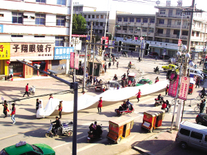 10名女孩客串“花童”,为一对“新人”托起长达20多米的婚纱亮相郸城县街头,引来许多市民驻足观看。这是11月4日,该县某婚纱摄影广场为宣传促销而采取的一种特别形式。晚报记者 徐松 摄 线索提供 刘先生