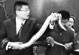 将一条长达2米多、重达5公斤的蟒蛇抱到课堂上当“模特”,教学生学习动物写生的技巧。武汉教师邹华章抱蟒蛇上课的视频,近日在网络上疯传。从10月27日上传到11月3日,共有400多个网站转载。 楚天 摄