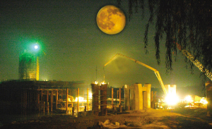 11月4日夜,一轮明月与建设中的沙颍河大庆路大桥相映成画。为早日建成大桥,近200名技术工人在加班加点地忙碌着。