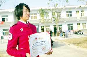 当天,在该县征兵体检站内,贺勤骄傲地拿出了她获得的荣誉证书(如图)和奖章。在荣誉证书上,记者看到了这样的文字:“在举世瞩目的新中国成立60周年国庆首都阅兵中,贺勤同志在女民兵方队圆满完成了党和人民赋予的神圣任务,特发此证。”
