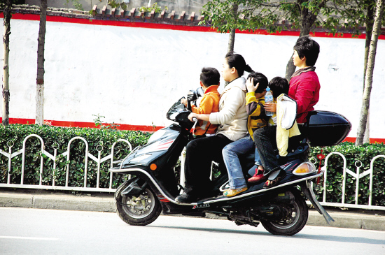 11月8日,在周口市区汉阳路上,一辆摩托车上竟坐了3个孩子两个大人。飞驰在马路上的这辆超载摩托车引得过往行人纷纷侧目。市民老王满脸惊讶地说:“我见过摩托车超载的,但从没见过这样超载的!这是在耍杂技哩?!”晚报记者 朱海龙 摄