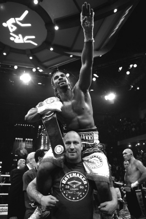 当地时间11月7日,在德国纽伦堡举行的WBA重量级拳王争霸赛中,英国选手海耶战胜俄罗斯选手瓦鲁耶夫,获得拳王称号。海耶(上)庆祝夺冠。新华社/路透