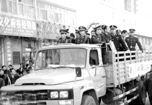 2008年,陕西警方将3名制造“5·29”特大持枪杀人抢劫案的犯罪嫌疑人押解回府谷县城,当地组织了盛大的游街仪式,有扭秧歌的,有举庆功横幅的。3名嫌犯颈吊大纸牌,被武警押在卡车上示众。