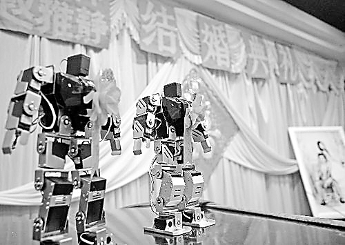 机器人“伴郎”“伴娘”现婚宴 节奏欢快的音乐声一响,分别带着写有“伴郎”、“伴娘”字样胸花的一对机器人摇头摆胯、弯腰挥手,跳出各种欢快的舞步,犹如新人一般。 11月8日,石家庄的一对新人的婚宴上,新郎新娘一按开关,两个机器人就可以按照预先调试好的程序做出动作。据机器人的研发工程师闫松伟介绍,这次是国内首次将机器人用在婚礼上担任“伴郎