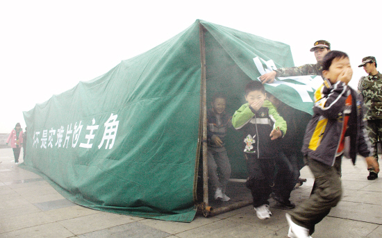 昨日是全国第19个消防宣传日。今年消防日的主题是“关注消防安全,共建和谐家园”。我市消防部门在市五一广场举行消防宣传活动,同时邀请市民参与体验。图为参与消防体验的市民从火灾模拟区里成功“逃生”。 晚报记者 朱海龙 摄