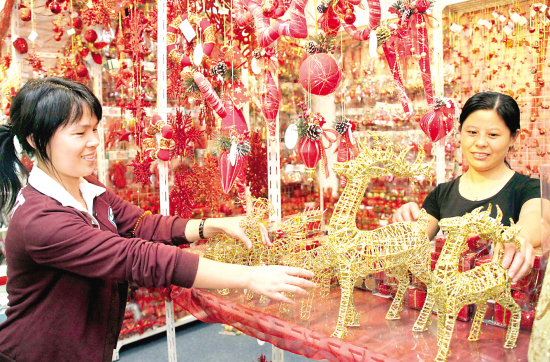 11月9日,瑞安林溪乡一家工艺品企业的工人在样品室摆放圣诞礼品新产品。 尽管离圣诞节还有一个多月时间,有“圣诞礼品乡”之称的浙江省瑞安市山区林溪乡的工艺品企业已向欧美、中东30多个国家发去了价值3亿元的圣诞礼品。在今年秋季广交会上,工艺品企业还签订了明年的供货合同及意向订单约4.3亿元,山村圣诞礼品出口出现回暖。 新华社发 庄颖昶 摄