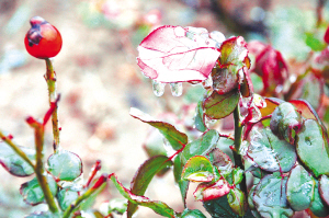 市气象专家介绍,10日,寒风吹了一天一夜,雨水不断,造成昨天气温骤降,落到树上的雨水急剧冷却结冰,形成冰衣。