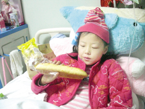 11月10日,周口监狱民警来到郑大一附院看望了梦梦。经历6次透析后,梦梦有些疲惫,但精神不错,一眼就认出那名送爸爸离监探亲的警察叔叔,并冲他做了个代表胜利的“V”型手势。梦梦香甜地吃着监狱民警买来的面包,脸上露出天使般的笑容(如图)。梦梦的母亲说,梦梦精神好的时候,会看一本《幸福的秘密》故事书,那本书是临床的阿姨送她的。得知爸爸很挂念自己,梦梦央求监狱民警给她照张满面笑容的照片带到监狱。尽管身体不适,梦梦仍坚持给爸爸写了封信。她在信中说:“爸爸,我爱你,你快点回来,我有点害怕!”