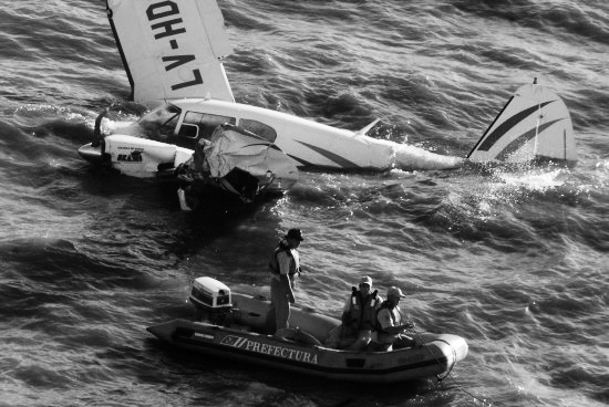 11月10日,在阿根廷布宜诺斯艾利斯省吉尔梅斯的拉普拉塔河河面,救援人员靠近一架坠入河中的小型飞机。当天,这架飞机在空中发生事故后坠河,所幸机上人员全部安全获救,无人伤亡。新华社发