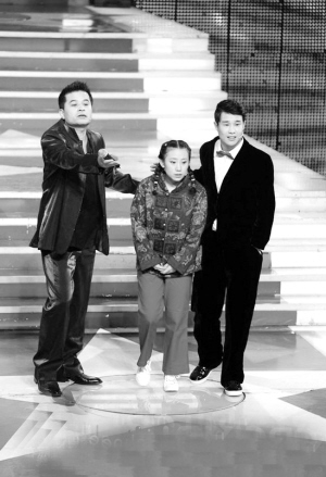 一番插科打诨后,小沈阳和丫蛋开始了和《星光大道》总决赛选手的较量。虽然嘉宾评委全是小沈阳和丫蛋的“娘家人”——《三枪拍案惊奇》剧组的主创人员,但前几轮亮分时,“不差钱”组合几乎没占什么上风。关键时刻,小沈阳和丫蛋终于抛出了杀手锏,也是当晚最大的噱头——小沈阳突然说要请“舅姥爷”来帮忙。“舅姥爷”一亮相,观众笑倒一片,原来“舅姥爷”就是张艺谋。“我和丫蛋的‘爷爷’(赵本山)是好朋友啊!自然他们得喊我‘舅姥爷’。”真没想到,张艺谋居然也会玩搞笑。