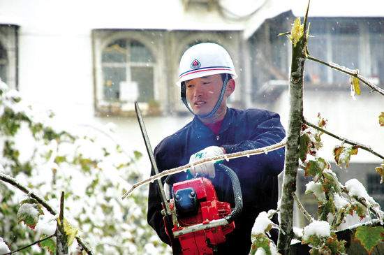 工人清理被大雪压断的树枝 晚报记者 朱海龙 摄