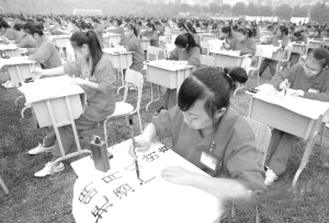 11月10日,重庆市女子职业中学操场上,千名重庆市中师、幼师学生举行“毛笔、硬笔、粉笔”书法素质大赛,弘扬中华传统文化。中新 摄