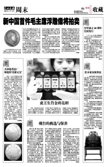 北京华辰拍卖公司今年的“建国六十周年红色经典”艺术拍品专场收到一件青铜张松鹤作《毛主席浮雕像》送拍作品,经有关专家鉴定及张松鹤夫人对该拍品辨认,确定为《毛主席像章》的侧面头像浮雕作者——张松鹤1950年初创作的作品。该件作品为新中国的第一件《毛主席浮雕像》,将于11月21日在北京华辰拍卖公司拍卖。