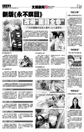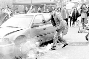本报综合消息 前日,江苏卫视自制剧、新版《永不瞑目》正式开机。在广州大学城探班过程中,记者见识了颇为壮观的一幕——先是欧阳兰兰撞车引发爆炸,再是肖童救美奋不顾身;更让人意想不到的是,由于“爆炸”时间没掐准,饰演欧阳兰兰的张俪没来得及抵达防护垫就已被炸趴下,胳膊、腿都蹭出了血。(章炎)