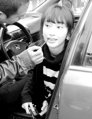 撞车之前,化妆师三两下就给张俪“抹”上了“血”(如下图)。这条红色的“血渍”在张俪脸上从清早挂到傍晚,甚至采访、吃饭、休息也没擦去。这条东西用的啥材料?张俪告诉记者,自己刚刚用嘴尝了尝,有点甜——原来就是通常挤在蛋糕上的果酱。