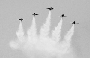 11月15日,庆祝人民空军成立60周年飞行和跳伞表演在北京沙河机场举行,空军八一飞行表演队和空军跳伞运动大队以精湛的飞行和表演技术,为中国人民解放军空军60华诞献上了一份精彩的贺礼。这是5架歼-7战机进行拉烟表演。 新华社记者 查春明 摄