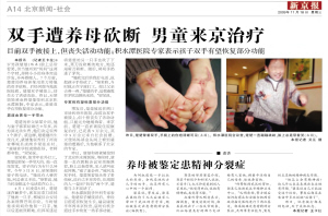 此次,陪楚楚一起进京的是他的父亲梁某。昨天,记者电话联系上了梁某,他说,他和楚楚一到北京积水潭医院,就备受京城各大媒体的关注,还有好多爱心人士来医院看望楚楚。记者在11月18日出版的《新京报》上看到,该报的A14版(如图)用大半篇幅,图文并茂地报道了楚楚来京治疗双手的消息。文中说,17日在医院会议室等候时,8岁的楚楚脸上总带着笑,在室内蹦跳着,见人就叫叔叔阿姨。“碰了还会疼。”被问及双手时,楚楚笑着低头看了看伤疤,说自己不再害怕。但周围的人一提到“妈妈”两个字,楚楚马上不说话了。