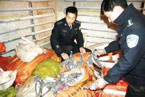 11月7日,太康县公安局五里口派出所民警接到群众举报,称该乡村民李某家中藏有毒鸟用的“药品”及大量被毒死的鸟。派出所所长查连廷立即带领几位民警赶到李某家将其控制住,并当场搜出斑鸠、麻雀、野鸡、喜鹊等1172只鸟类尸体及毒鸟用的“药品”5.5公斤。接着,民警又在该乡一座冷库内,查获李某藏匿于此的斑鸠、麻雀、野鸡等鸟类尸体21081只。