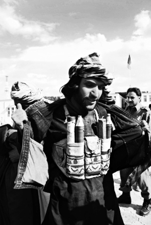 (右图)一名被收编的塔利班士兵展示将要交给政府的武器。(潘立文 摄)