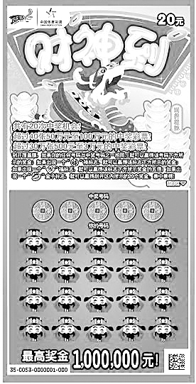 本报综合消息 临近岁末,即开型体育彩票“财神到”携百万大奖隆重上市。所谓“财神到”,财运到! “财神到”是继“点石成金”、“冲向顶峰”之后,即开型体育彩票“顶呱刮”第三款20元票,其独特的设计和玩法势必会从彩民的视线中脱颖而出,成为中国即开票市场另一支主力票种。