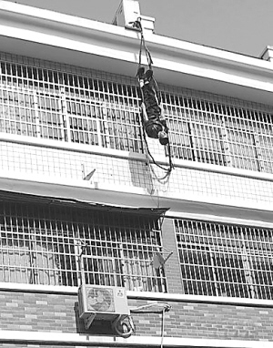 本报综合消息 “逼婚”不成,男子重伤女友后竟欲跳楼轻生(上图)。24日上午,浙江义乌市上演了一出令人咋舌的跳楼闹剧,一名54岁的男子将女友砍成重伤后欲跳楼轻生。经当地警方、消防人员4个小时的劝阻,该男子最终被救了下来。