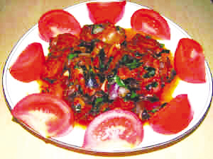8.收汁后,下葱粒、蒜粒同炒。将番茄块摆盘做装饰,排骨盛入盘内,即可食用。