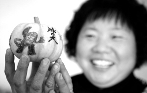 11月25日,上海金山区廊下镇中华村一位村民展示“世博南瓜”。