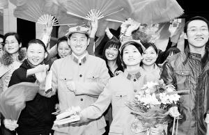11月25日,在延安市宝塔区举行的大学生“村官”培训班联欢会上,众“村官”簇拥着身着红军服的新郎叶伟强(前左二)和新娘谢丹丹(前右二)扭起陕北秧歌。两位年轻人成为延安首对大学生“村官”夫妻。