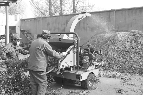 11月29日,北京花乡花木集团枝叶处理厂工人在处理园林绿化废弃物。人们司空见惯的枯枝、落叶、植物根茎等园林垃圾,经机器粉碎、发酵等工序处理后,变成了可用于花木种植和农业生产的有机肥料。 2009年,“北京市园林绿化废弃物资源化再利用关键技术研究及产业化推广”项目实施,使北京市的园林绿化废弃物逐步得到有效利用。目前,北京西城、朝阳、丰台、顺义已