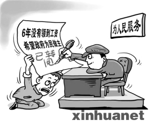 农民工写一千多字的信向政府反映6年没有领到工资,希望能帮助100多民工讨要到工资。当地政府却用十多个字“已转区劳动局和五宝镇阅处”敷衍回复了事。(11月26日《重庆晚报》)